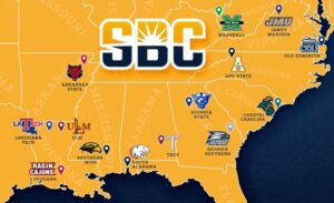 The Sunbelt Western Division features Arkansas State (Jonesboro, Arkansas), Troy University (Troy, Alabama), South Alabama (Mobile), Southern Miss (Hattiesburg), and two Louisiana-based schools.