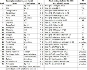 Let’s lighten the mood with this week’s latest SwampSwamiSports.com College Football Top 25 rankings for the week ending October 25, 2025!
