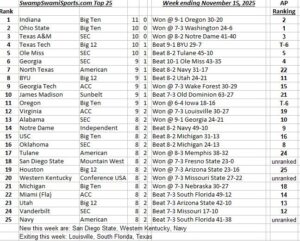It’s time to check out the brand new SwampSwamiSports.com College Football Top 25 rankings for the week ending Saturday, November 15, 2025: